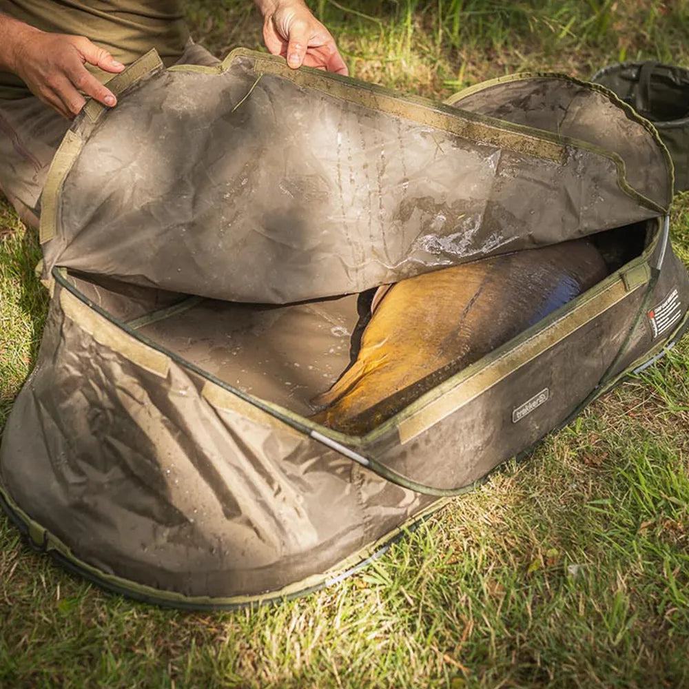 This is based on the ever-popular, quick-erect walled unhooking mat design, and maintains super-fast set-up and pack-down properties. The Sanctuary Insta-Mat offers total protection in a compact, lightweight and user-friendly package. The mat fully unzips to reveal the lightweight outer frame, which once unfolded simply assembles itself, with the open base then positioned inside with the soft PVC material facing upwards, so the mat is assembled and ready for use, with pack-down being just as simple. A twist of the outer frame means it folds down into two neat circles, and this is then placed inside the padded mat, folded in half and zipped up ready for transport. The 50mm thick soft padded base is covered in fish-friendly PVC and offers the utmost protection to fish. The30cm raised ends and reinforced raised side walls maintain structure and eliminate the chance of fish sliding off the mat. There is also a full Velcro fastened top cover to keep lively fish calm and safe. There are webbed straps at either end for pegging the mat down in windy conditions, and hanging it up to dry out at the end of a successful session. The mat doubles up as a very handy stalking seat for the mobile roving anglers, and is perfectly at home for a week-long session on a big pit or just an evening on the river.