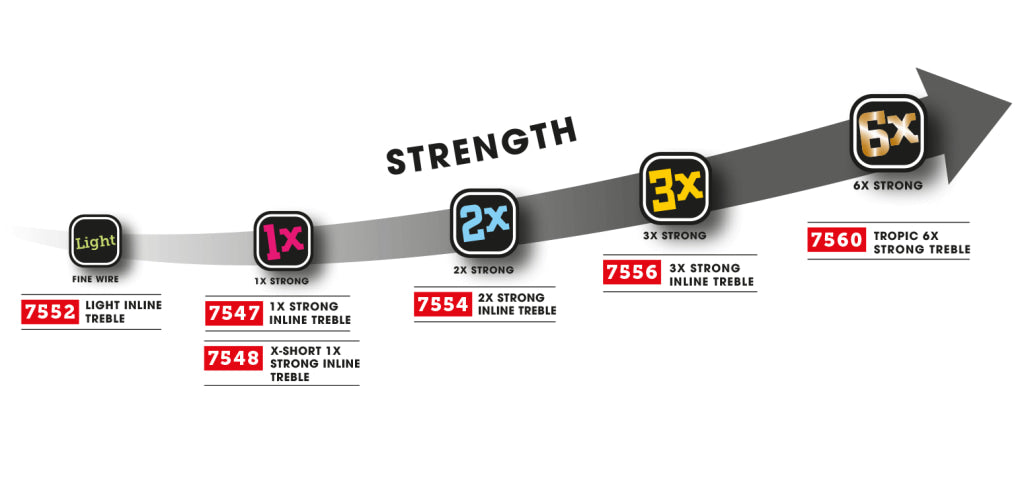 Built with VMC®'s latest extra-sharp ground Needle Point. Inline Treble hook for perfect balance. Extra wide gap. Also available in barbless version, see VMC - 7554B 2X-Strong Inline Treble Hooks (Barbless).